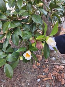 ホラ、白い椿と赤い椿が咲きかけていました !!