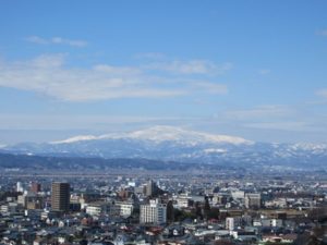 朝日山脈も霊峰といわれる通り、真白い山々が青空に映えて・・・。