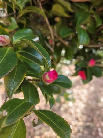 ホラ、白い椿と赤い椿が咲きかけていました !!