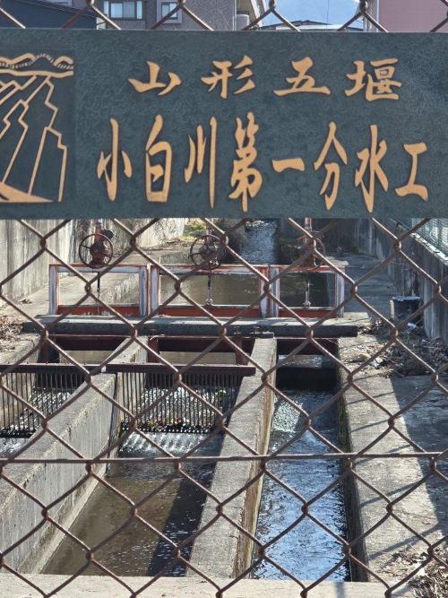 しばらく歩いていたら、オヤオヤ、山形五堰の小白川第一分水工を見ることができました~。